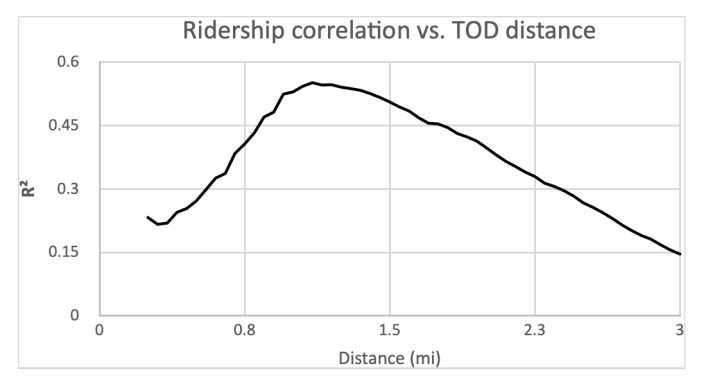 For each chosen TOD distance a best-fit trendline is shown for ridership versus nearby population, and the trendline shows the R² value, which is a measure of how much of the variation in ridership is accounted for by population. An R² value of 1 would mean 100 percent of the variation is accounted for, indicating a perfect linear relationship whereas an R² value of 0 would mean 0% is accounted for, meaning there is no correlation at all. With the current 0.5 mile distance, only about 27 percent of the ridership variability is accounted for, increasing it to a distance of 1 mile increases this to 53 percent, indicating that population within a mile correlates much better with station ridership than population within half a mile. Too large of a distance weakens the relationship as well, since people tend to not travel two or three miles to get to a train station.