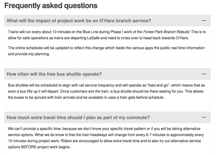 However, on Thursday Göttlicher told Streetsblog the CTA had recently added FAQs at the bottom of the FPBR info page addressing the very questions CTAAction had raised. The site stated “Trains will run [about every] 10 minutes on the Blue Line during Phase 1 work,” instead of the usually scheduled 6-7 minute headways during rush hours.