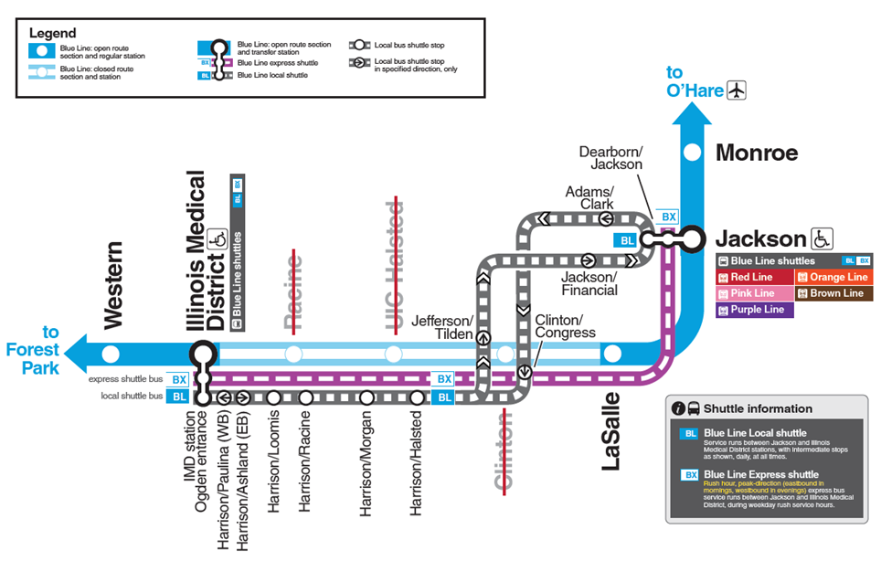 “CTA is still reluctant to give riders estimates of how their travel time will be affected,” Göttlicher said. He said the GTFS dataset shows that the Local Blue Line shuttle between Jackson and IMD has a total travel time of 24-26 minutes, compared to 9 minutes on a pre-Phase 1 Blue Line run. “Accounting for transfer time, I’d imagine this shuttle will add at least 20 minutes, but more likely 25-30 minutes of extra travel time for Blue Line riders who wish to travel across the closed section.” The Express Blue Line shuttle has a travel time of 16 minutes. “We don’t understand why the CTA does not want to share these facts with riders.”