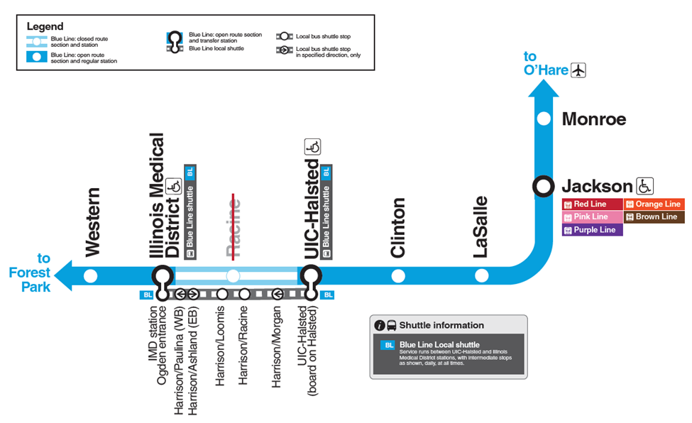 After the LaSalle-to-UIC/Halsted track work is finished and the Clinton and UIC/Halsted stations reopen in late August, the local shuttle will only run about a mile between the IMD and UIC/Halsted stops, while track and station work is completed on this stretch. There will no longer be an express shuttle during this time, dubbed Part B, which will last until October 7.
