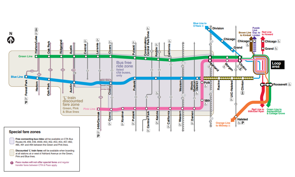 To encourage Blue Line riders to use alternative service options during the Phase 1, CTA is offering free rides on some north-south buses running between the Green and Pink lines. Between Austin (6000 W., #91 route) and Ashland (1600 W., #9 and #X9 routes) avenues, bus drivers will let riders board for free in the designated no-fee zone, as shown below.