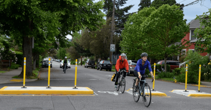 CBGN also suggests installing sidewalk extensions and chicanes (mildly slaloming routes that force drivers to slow down) on Bike Grid streets.