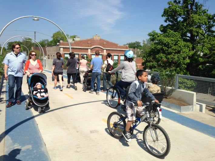 One reason why, contrary to what the advocacy group People for Bikes recently reported, Chicago is not one of the very worst large U.S. cities for biking (although we do have lots of room for improvement) is the Bloomingdale Trail. Opened in 2015, this 2.7-mile elevated greenway, aka The 606, currently spans across Humboldt Park, Logan Square, Bucktown, and Wicker Park. It’s a wonderful corridor for recreation on foot and bike, as well as a useful car-free route for east-west commuting.