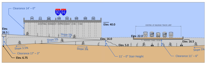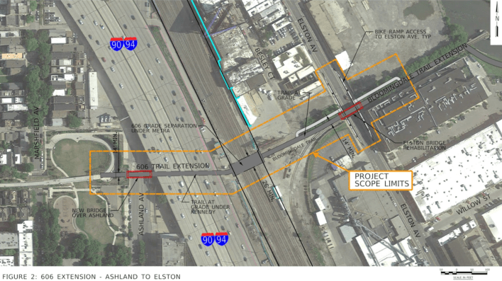 The scope of the work include a new bridge over Ashland, a new bike-ped underpass at the UP-NW (which will require a permanent easement from rail corridor owner Union Pacific), and rehabbing an existing abandoned rail bridge over Elston. The work is supposed to have no effect on the Kennedy, which is currently seeing traffic delays due to bridge reconstruction work.