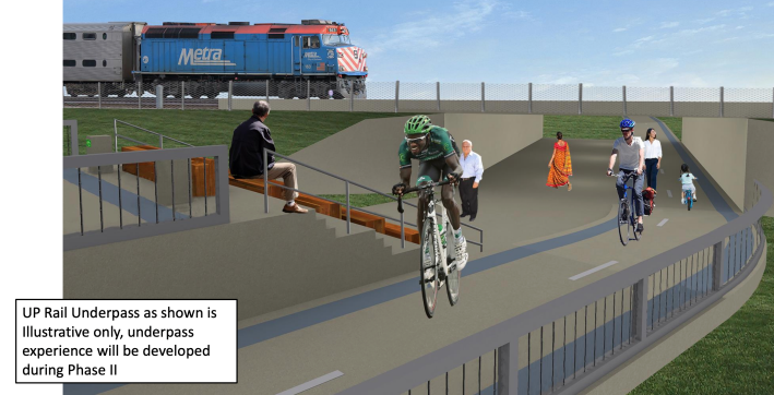 The project will create safer and more pleasant bike-ped connection with neighborhoods to the east, without trail users having to take streets to get past Ashland, the Kennedy, and the UP-NW tracks. That will let people avoid the intimidating Cortland Avenue/Ashland intersection just north of the trailhead.