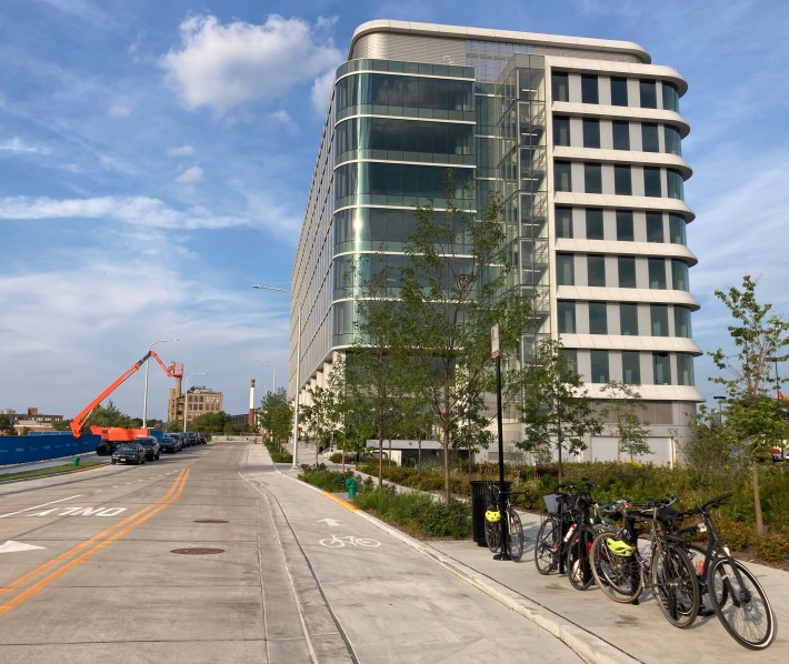 Last week’s presentation was held at Lincoln Yards’ first and only building so far, its life science center at 1229 W. Concord Pl. The block, located just north of North Avenue and East of Elston, features a short stretch of European-style raised bike lanes. That would have been more impressive if the bikeways weren’t largely clogged with parked cars on one side during the meeting.