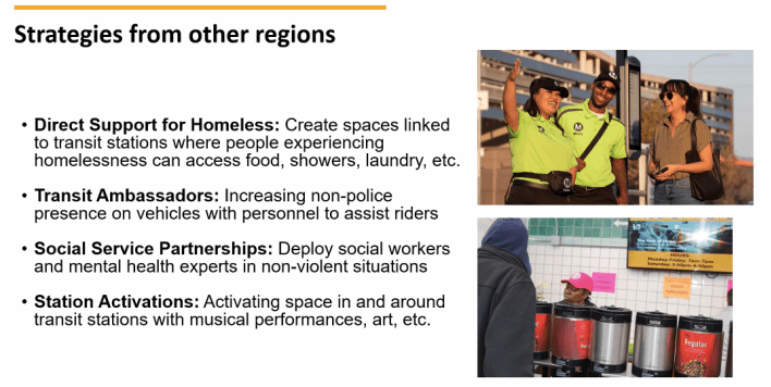 The second strategy is deploying transit ambassadors – unarmed eyes-on-the-street workers trained in de-escalation to make riders comfortable and deter crime. The concept is popular with transportation advocates as an alternative to increased policing of transit.