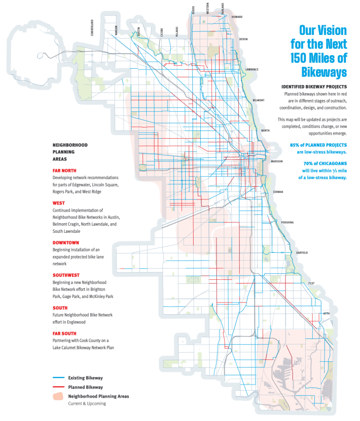 “Our vision for the next 150 miles of bikeways provides more than half a million more Chicagoans with access to low- stress bikeways,” the report states. “Currently, half of Chicagoans live within a half mile of a protected bike lane, neighborhood greenway, or off-street trail. Implementation of these projects will result in 70 percent of Chicagoans living within a half mile of a low-stress bikeway.”