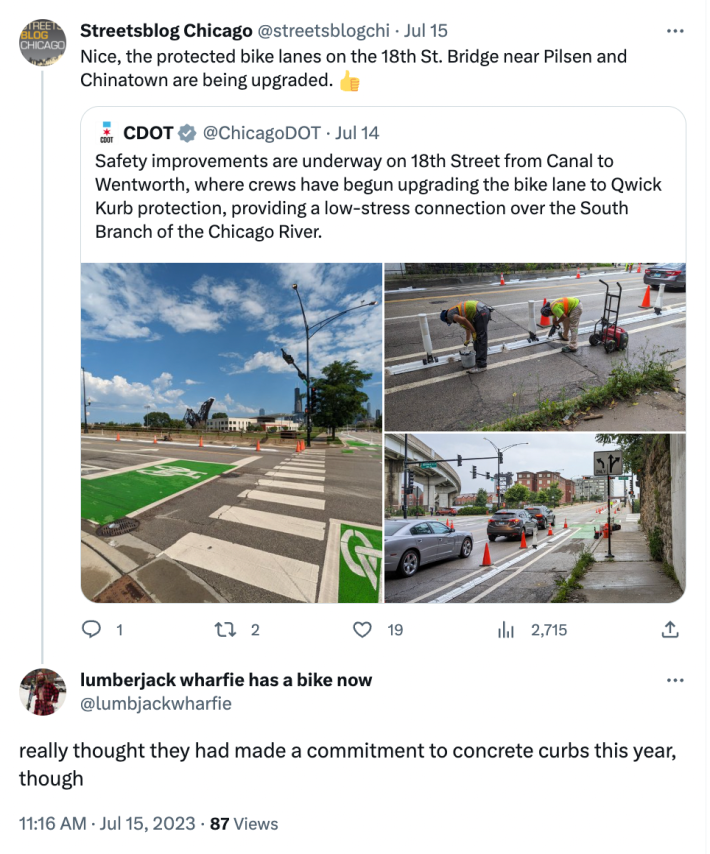 [After CDOT tweeted images of a crew upgrading the 18th Street Bridge’s paint-and-post lanes with Qwick Kurb curbs and flexible posts, which are less durable than concrete curbs, on July 14, bike advocates asked why concrete wasn’t being used. After all, in June 2022 the department put out a press release titled, “Chicago To Upgrade All Protected Bike Lanes to Concrete by End of 2023.”