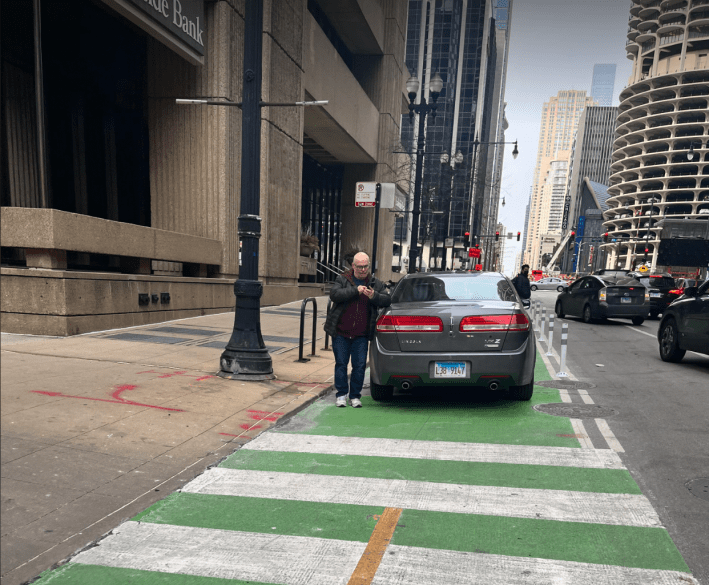 Citizen: “[The Washington St. non-protected bike lane] between Canal and Wacker Dr. [300 W. at this location] is another hot spot for bad driver behavior, but is noticeably missing [curbs]. Can curbs be installed on the western section of this block?”
