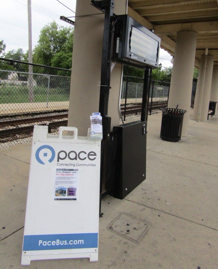 When I was at Metra’s downtown Des Plaines Union Pacific-Northwest Line station yesterday, a Pace transit ambassador gave me a handout outlining the ART bus service basics and a printout with the location of the Pulse stations. He explained that riders who used to board buses across the street would now have to board them at the newly built Pulse station a block east. That wouldn’t be immediately obvious to anyone trying to make that transfer, and that extra block walk to the new bus might be a deterrent to using it.
