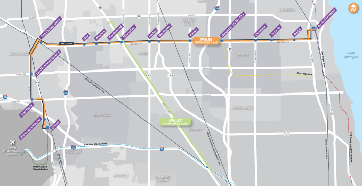 Pulse Dempster will follow the existing Route 250, which largely serves Dempster Street between Evanston and downtown Des Plaines before turning south to serve the O’Hare Multi-Modal Facility. Route 250 currently runs every 20-30 minutes on weekdays and every 30-60 minutes on weekdays (the headways get longer in the evening). Pulse Dempster will run every 15-20 minutes, while Route 250 will run every 30 minutes during rush hours and every sixty minutes the rest of the time. While Pulse Dempster will run until 1:00 AM, the way Route 250 currently does, the pared-down Route 250 will stop running around 10:00 PM.