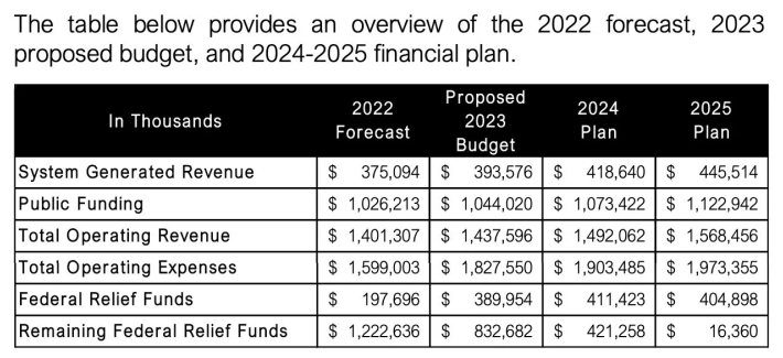 Remember last February when then-Mayor Lori Lightfoot insisted during a mayoral debate, “There’s not going to be a fiscal cliff for the CTA because the CTA… has budgeted in the out years to make sure that there are sufficient funds”? Her claim that the transit agency is not facing a pecuniary precipice didn’t even jibe with the info that the agency, which she controlled, had put out. Its 2023 budget document included the chart below showing the system has been relying on hundreds of millions of dollars in federal relief funds a year to plug its COVID-era budget holes, and unless more federal aid is passed, the system will have a nearly $400 million gap by 2026.