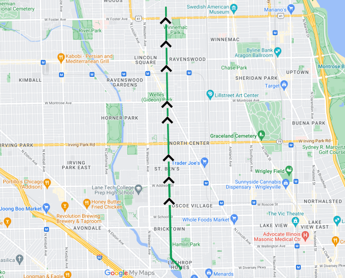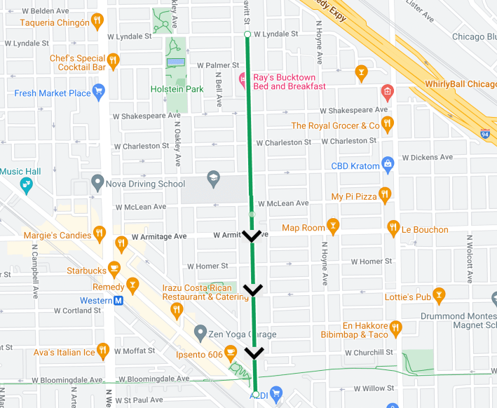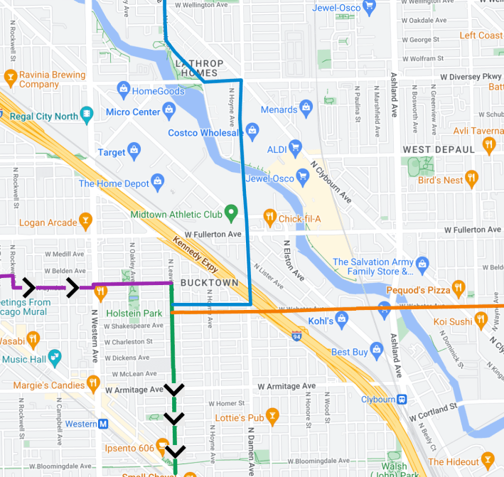 That’s only five-eighths of a mile, but it will come in handy. There’s an entrance to the Bloomingdale Trail, aka The 606, elevated greenway at Milwaukee/Leavitt. Just south of Leavitt is Webster Avenue (2200 N.), which you can take eastbound to get under the Kennedy Expressway and the Chicago River and into Lincoln Park. Or you can take Webster east to Damen Avenue (2000 W.), and head north under the expressway and over the river to Diversey, where you can roll west to the Leavitt Greenway again and ride north into into the North Center neighborhood.