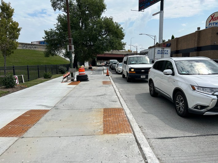 Passing back under the Kennedy viaduct westbound, the bike lane diverts onto the sidewalk, then to curb protection on the street, then back to the sidewalk briefly near the Bank of America west of the expressway. On-street curb protection continues a little further west, ending near Christiana Avenue.