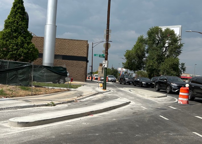 I crossed at Kimball to return to Kedzie, planning to turn right under the now-safer-but-still-awfully-dark-and-dank Kennedy viaduct. Instead, I was delighted to find a new curb-protected lane on the short leg of Avondale, a short, southeast-bound diagonal that connects Belmont to the southbound side of Kedzie. It was blocked off to drivers for workers putting the finishing touches on a new curb cut. I thanked them as I rode by, making a soft turn onto the Kedzie protected lane.