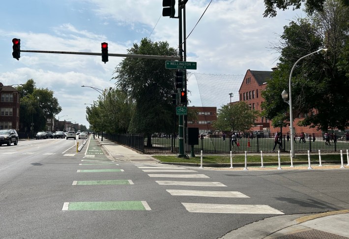 The intersection of Belmont (3200 N.) and Kedzie (3200 W.) avenues used to be one of those confusing, viaduct-beshadowed, high-vehicle traffic spots that even the most seasoned city bike rider white-knuckles their way through. But thanks to new concrete-protected bike lanes on Belmont, one of the city’s most unpleasant and dangerous intersections is now a choice route for people traveling on two wheels.
