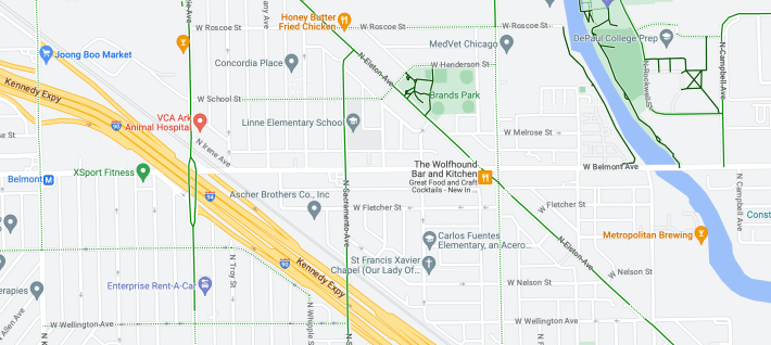 Curb protection picks up again just before a bus boarding island at Campbell, joining up with curb-protected lanes on Campbell, which ushers riders two blocks onto Roscoe Street (3400 N.) and a bikeable route eastward. I crossed Belmont at Campbell to ride the westbound PBL and was met with one of the most exciting features of the new facilities: a curb-protected lane that leads to a sidewalk apron at the entrance of the North Branch Riverwalk, part of the 312 RiverRun car-free trail system that runs 1.5 miles through parkland Between Belmont and Montrose Avenue (4400 N.) You can now easily ride onto the sidewalk and down a ramp to the riverwalk without getting off you bike.