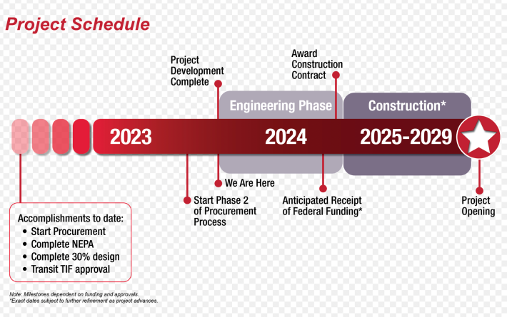 According to the CTA, the transit agency can now kick off the project’s “Engineering” phase of the project, including further design and engineering it needs before construction. It also IDs the federal grant cash the RLE can win after the FTA signs off on the completed engineering work. The Engineering phase is slated to run into 2024, with hopes that the feds will award the funding by the end of that year.