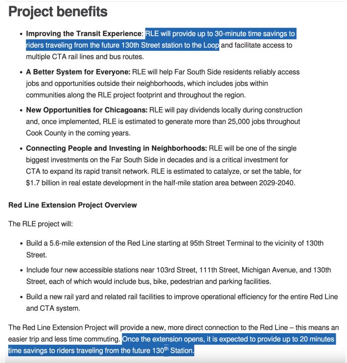 The project’s website states, “RLE will provide up to 30-minute time savings [emphasis added] to riders traveling from the future 130th Street station to the Loop.” But oddly today’s press release says, “Once the extension opens, it is expected to provide up to 20 minutes time savings [emphasis added] to riders traveling from the future 130th Station. The CTA did not immediately respond to my question about this one-third drop in estimated time saved.