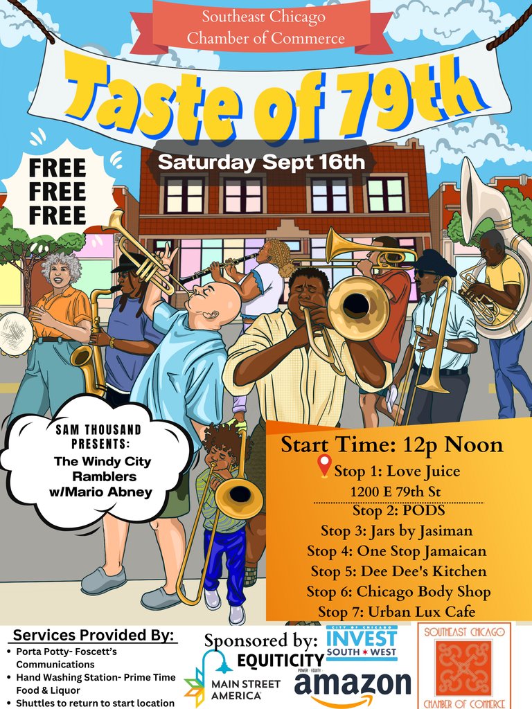 On Saturday afternoon, the Southeast Chicago Chamber of Commerce and the mobility justice group Equiticity hosted the Taste of 79th Community Walk. It was a stroll and tour through the 79th Street business corridor in the South Shore, Avalon Park, and South Chicago community areas.