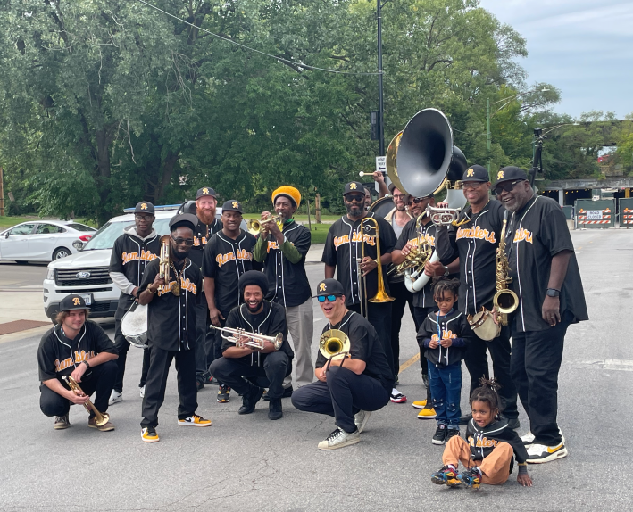 The walk featured a second line band, Sam Thousand Presents: The Windy City Ramblers, with Mario Abney. The Ramblers’ website describes them as “a nonprofit brass band organization that is dedicated to the cultural development of the youth of Chicago through the brass band and second line culture.”