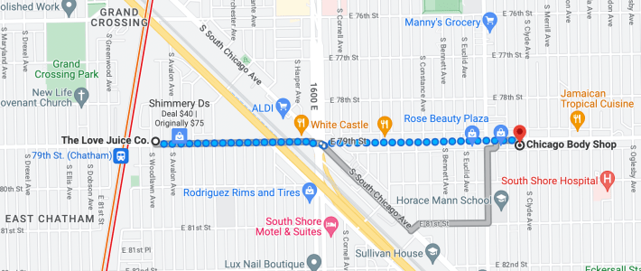 The de-facto parade met at noon at Love Juice Co., 1200 E 79th St., just east of the 79th St. (Chatham) Metra Electric District commuter rail station. The walk ended a mile later at Chicago Body Shop, 2047 E. 79th.