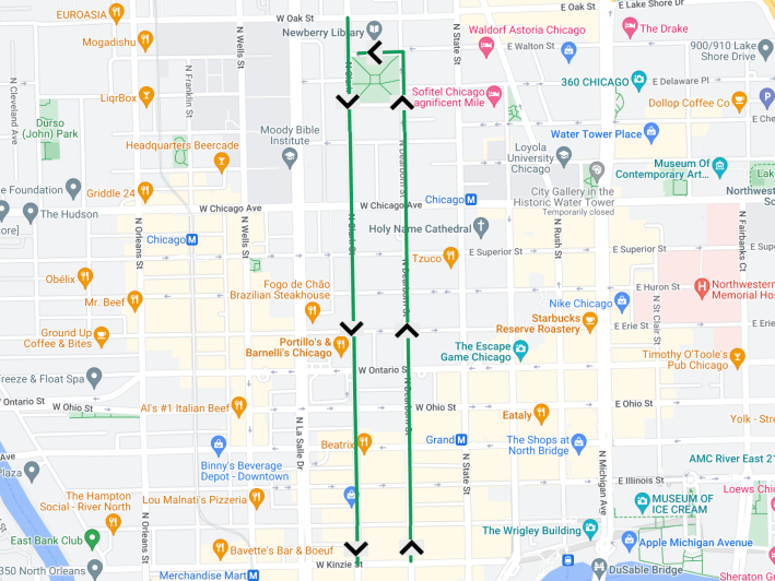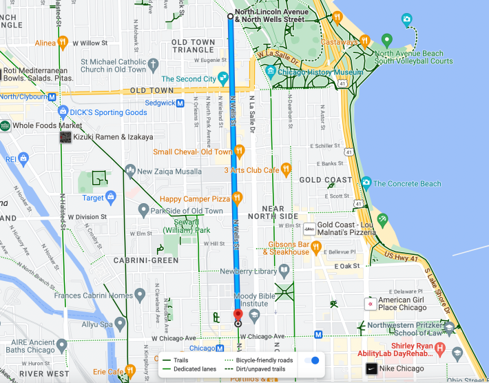 Unfortunately, if you want a lower-stress bike route to downtown from these neighborhoods with protection from motorized traffic, you generally need to detour to the (usually) car-free Lakefront Trail. Wells, Clark Street (100 W.) and Dearborn Street (30 W.) are widely-used north-south on-street bike routes across the Near North Side that have painted bike lanes. But they have no physical protection from motorists north of Kinzie Street (400 N.) in River North, where chaotic, sometimes deadly, driver behavior is common.