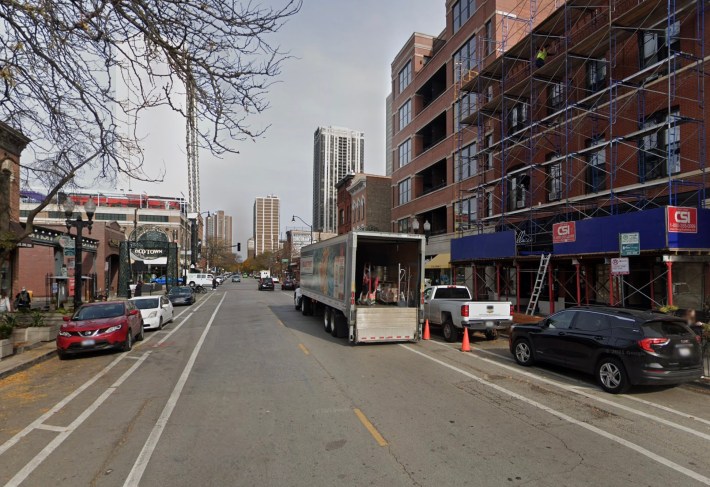 Pelrine had some bad news too, though. While CDOT had, in fact, proposed PBLs on Wells between Chicago and Lincoln avenues, “they couldn’t figure out a way to make it work.” He noted, accurately, that there are major problems with delivery drivers blocking the existing non-protected bike lanes and mixed-traffic lanes, particularly between Division Street (1200 N.) and North Avenue (1600 N.) in Old Town, which is full of restaurants and bars. “Obviously that’s not an ideal situation.”