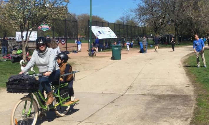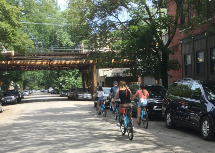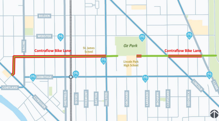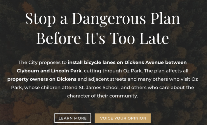 But surprisingly many neighbors argued at the first community meeting that the treatment would make the corridor more dangerous, claiming more people riding bikes on Dickens would endanger pedestrians. They were alarmed at the possibility of more cyclists riding on a multiuse path through Oz Park as part of the route.