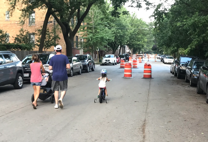 Before we take a look back at the truly bizarre backlash that delayed this moment so long, here’s a quick update from CDOT on what’s what’s on deck for the 1.25-mile corridor. “Construction began yesterday on the Dickens Greenway and is expected to last through the fall,” spokesperson Erica Schroeder told Streetsblog today. “The project includes a variety of traffic calming elements on Dickens Avenue [2100 N.] between Magnolia Avenue [1230 W.] and Stockton Drive [230 W.] to make the street more comfortable for everyone – whether they are walking, biking, or driving.”