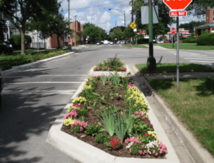 Good news: The Chicago Department of Transportation recently started installing detached curb bump-outs on Leland Avenue (4700 N.) at almost all of the intersections between Clark Street (1430 W.) and Sheridan Road (1000 W.) According to CDOT, detached bump-outs differ from attached ones (aka sidewalk extensions) because they “float” one foot from the existing curb line for better drainage. But they shorten the crossing distance for pedestrians, stop drivers from illegally parking too close to a crosswalk (which blocks sight lines), reduce turning speeds, and calm traffic by making the road seem narrower.