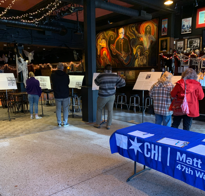 On Wednesday evening Ald. Matt Martin (47th) and the Chicago Department of Transportation hosted a community meeting on proposals to redesign the Irving Park Road (4000 N.) / Damen Avenue (2000 W.) / Lincoln Avenue intersection. This complex six-way junction has seen 47 crashes since 2020. The event took place at Martyr’s, 3855 N. Lincoln Ave., a music venue in North Center, just down the street from the intersection.