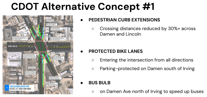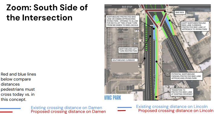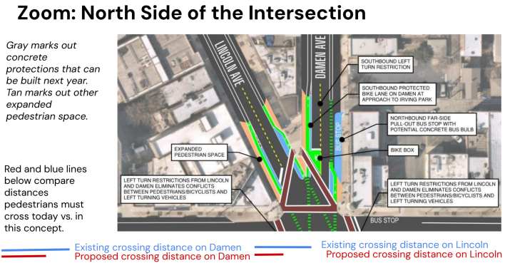 “One of the big improvements that we can make through elimination of the left-turn lanes from Damen is that gives us a lot more space to work with,” said Facknitz. This approach would also allow for sidewalk extensions to reduce pedestrian crossing distances for Damen and Lincoln by 30 percent. It would also make room for building protected bike lanes to shield riders as they enter the intersection from Damen and Lincoln, while parking-protected lanes could be put in on Damen south of the junction.