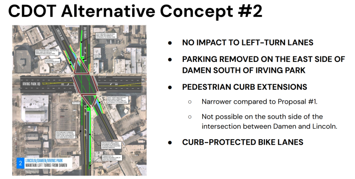 Alternative Concept #2 would have no impact on Damen’s left-turn lanes, but it would eliminate car parking on the east side of Damen south of Irving Park. The curb extensions would also be narrower than with Alternative Concept #1 and wouldn’t be possible at all on the south side of the intersection between Damen and Lincoln. Alternative Concept #2 would also have curb-protected bike lanes, but no parking-protected lanes on Damen south of Irving Park.