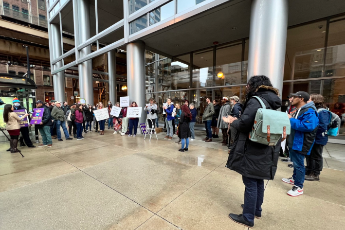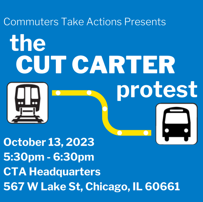 Last Friday’s Cut Carter Protest, organized by Commuters Take Action (CTAction), was a great example of the effectiveness of grassroots Chicago sustainable transportation advocacy. Despite rainy weather, dozens of people showed up for a rally after work outside the CTA headquarters, 567 W. Lake St., “to demand ample service and good labor practices from CTA President Carter and leadership,” according to the invite.