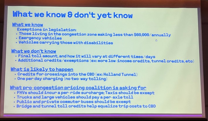 As Valdivia explained at the start of the talk, New York City’s congestion pricing program hopes to reduce traffic in Manhattan’s central business district, and also raise $1 billion a year for the the MTA. It became law in 2019, but it was delayed for several years by the Trump administration. But in 2023, the Biden administration gave its final sign-off, paving the way for congestion tolling to begin, which is now expected to start in mid-2024.