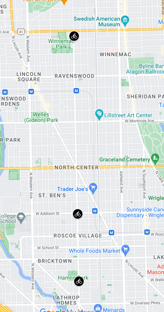 Damen Avenue, a two-lane street, is a popular bike route, but it’s also a hectic driving street. Fortunately, the Chicago Department of Transportation, with the support of local alderpersons, recently built a Neighborhood Greenway on Leavitt Street (2200 W.) two blocks west of Damen. That route runs between Diversey Parkway (2800 N.) and Montrose Avenue (4400 N.), a relatively calm side street with stoplights or four-way stops at all major intersections. The greenway includes new contraflow bike lanes to legalize southbound cycling, plus bike-friendly speed humps. It will eventually run up to Berwyn Avenue (5300 W.)