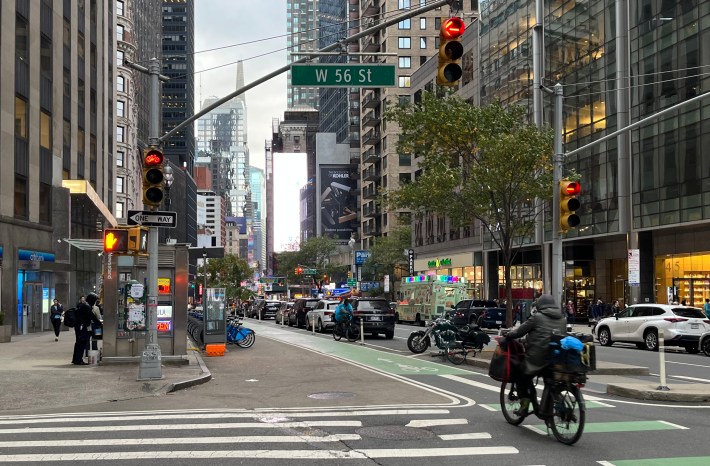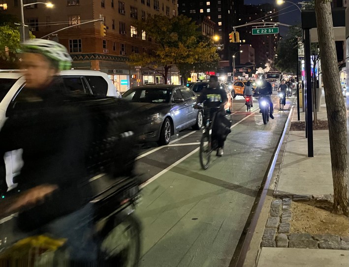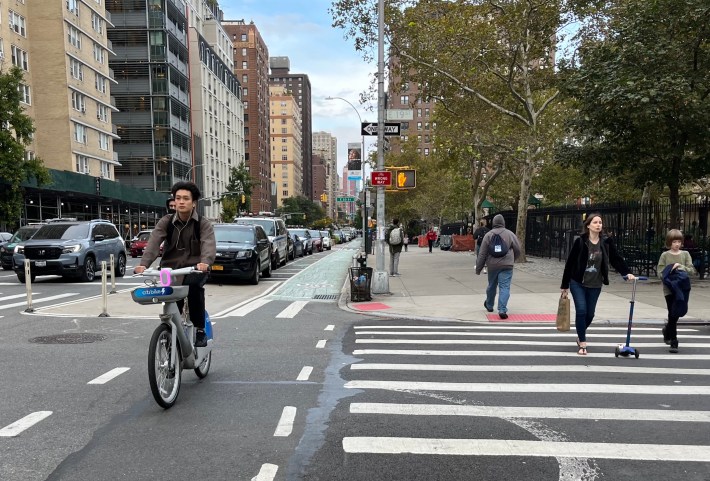 Bur Gersh suggested that my relatively hassle-free experience riding New York's protected lanes might have just been good luck. "The city’s parking protected bike lanes work OK, but there are often daylighting issues [parked cars blocking motorists' views of people in crosswalks], such as drivers that park too close to the curb, which is legal in the city," he said. "The city tries to prevent this by painting the corners in light brown paint, but it never works. The posts [delineating the no-parking area] always get knocked down by drivers parking on the brown zones."