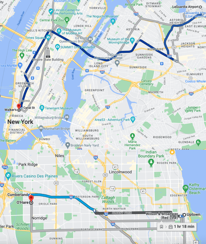 The whole 10-mile trip, leaving around 7 p.m. on a Wednesday, took about an hour. That's a little faster than my usual 1:15 to 1:30 bus + Blue Line trip from Chicago's Uptown neighborhood to O'Hare, which covers roughly the same distance. ("Your ride from the airport to the train to the bar was exceptionally lucky," Streetsblog NYC editor Gersh Kuntzman told me. "Normally, add at least 15 minutes to your time."