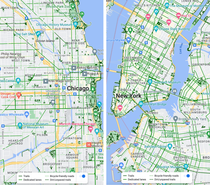 Our city's Chicago, Bike Grid Now! advocacy group is tirelessly pushing for a citywide low-stress bikeway network. But least in Manhattan and some other cycle-centric parts of town, NYC basically already has a bike grid, now. In stark contrast to when I last visited in late 2014, just about all of my riding took place on protected bike lanes. (Gersh responded, "This is far less common outside the wealthiest neighborhoods in town.")