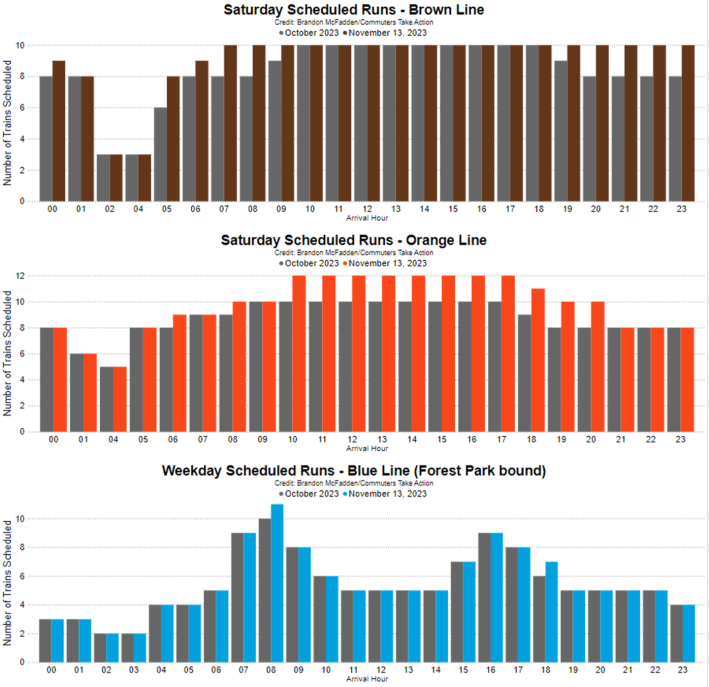 “We are disappointed by the CTA’s lies about Blue Line service,” Commuters Take Action said after the new schedule became available. “Earlier, the agency stated that Blue Line service would go back to pre-Forest Park Rebuild service levels in mid-November. However, the Bue line has 13 percent less scheduled service now than it did in July 2023, and 35 percent less than 2019.”