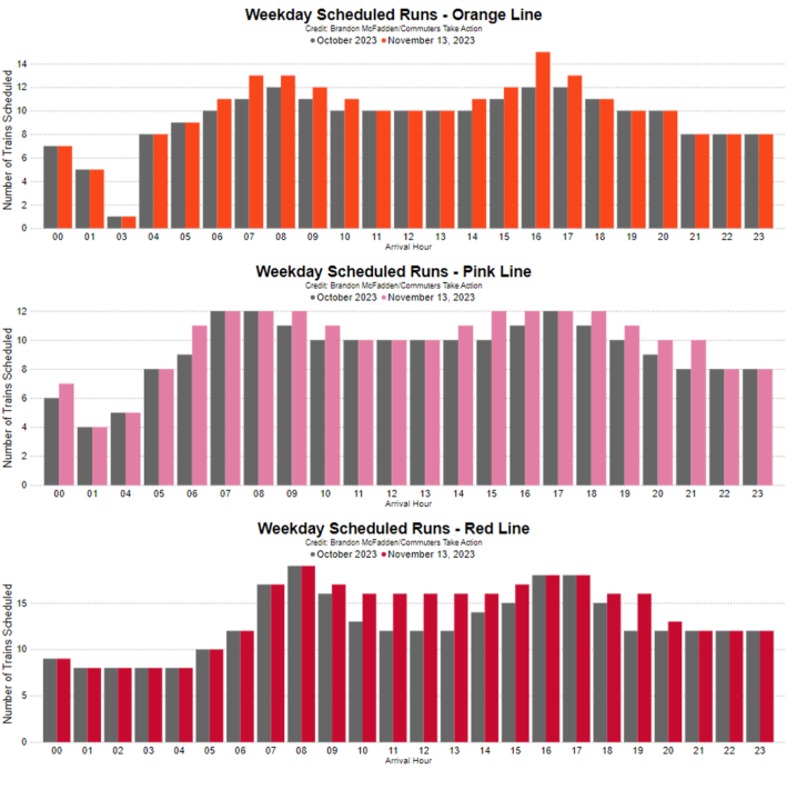 Weekday scheduled runs for the Orange, Pink, and Red lines in October 2023 (gray) and on November 13, 2023 (color). Image: Brandon McFadden, Commuters Take Action