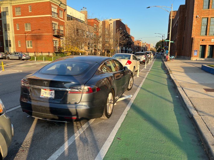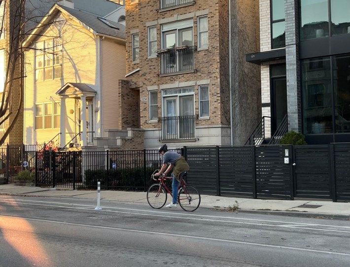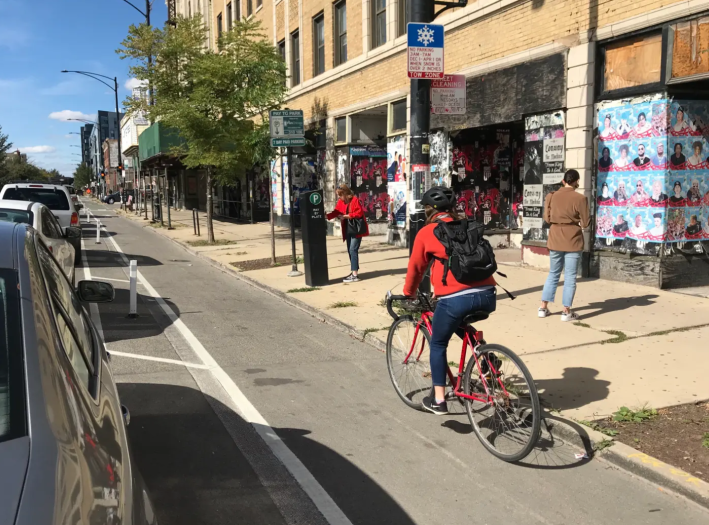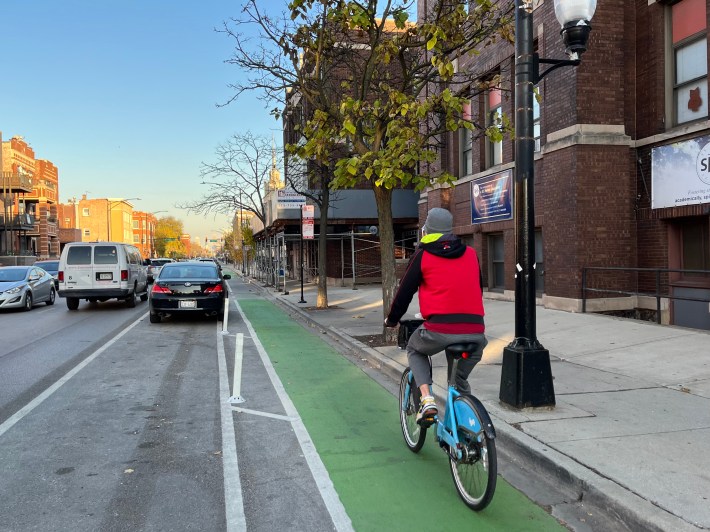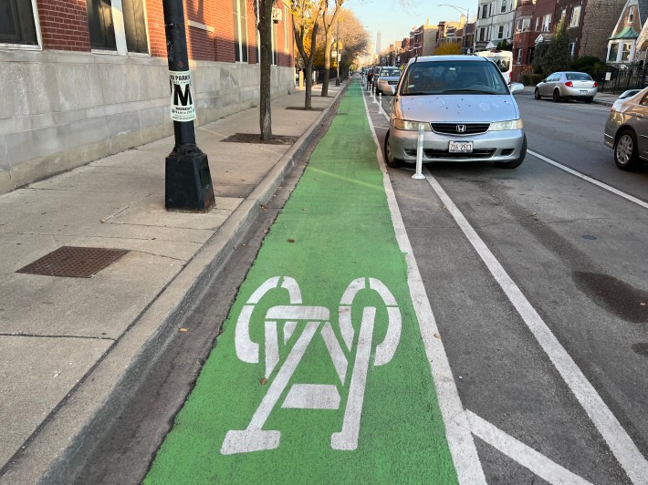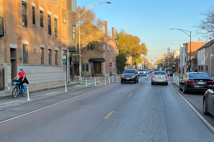 Thant’s not to say that everyone loves protected bike lanes, like the new Augusta Boulevard PBLs (1000 N.), which debuted in early August and run 1.3-miles across West Town between Western (2400 W.) and Milwaukee avenues. Last week we reported that these lanes are at risk of “changes to the design” due to mostly dubious complaints from car-focused members of the local Ukrainian Village Neighborhood Association.