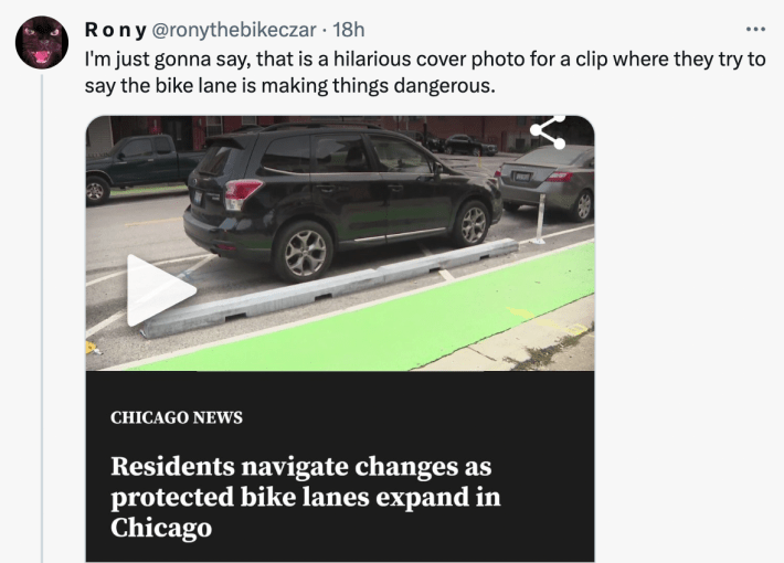Here’s a good example from Rony Islam, cofounder of the advocacy group Chicago, Bike Grid Now!, pointing out that the lead image for the segment, with interviews from people saying the bikeway is dangerous, shows an illegally parked car.