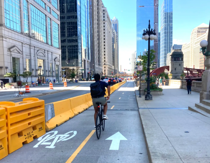 Late year summer CDOT started extending the Dearborn protected lane north of Kinzie into River North as a northbound-only concrete-protected lane. They also announced that Clark Street in River North would be getting a similar treatment next year, with a permanent southbound PBL. Read about those projects here.