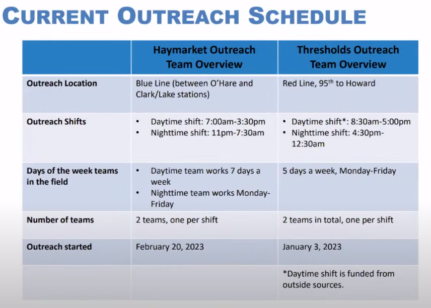 Both Thresholds and Haymarket Center primarily provide treatment for substance use disorder and mental health issues. Since the start of this year, Thresholds has been covering the Red Line. Haymarket Center has served the Blue Line between the O’Hare station and the UIC-Halsted stop. Thresholds doing outreach even before the 2022 agreement, but the infusion of funding allowed them to add a shift.