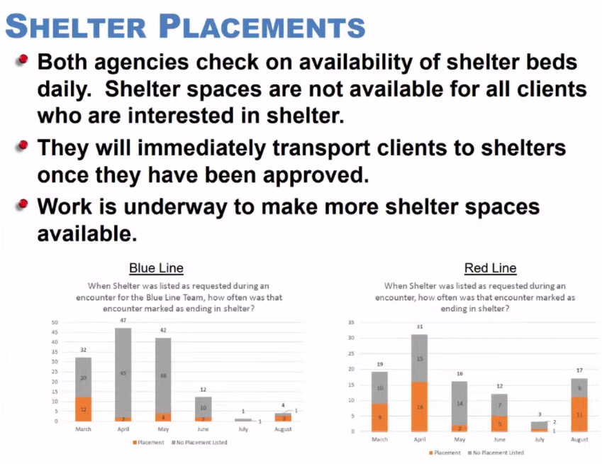 The statistics shared in McKone’s presentation show that’s easier said than done. According to the 2023 Point in Time Count, the annual survey of homeless people conducted in Chicago in January, 546 unhoused people were sheltering on the CTA. Threshold and Haymarket outreach workers report that 80 people were placed in shelters. Out of 236 people who signed up to get more permanent housing through the city’s Coordinated Entry System, only 24 have been placed, and five people were in the midst of the placement process at the time.