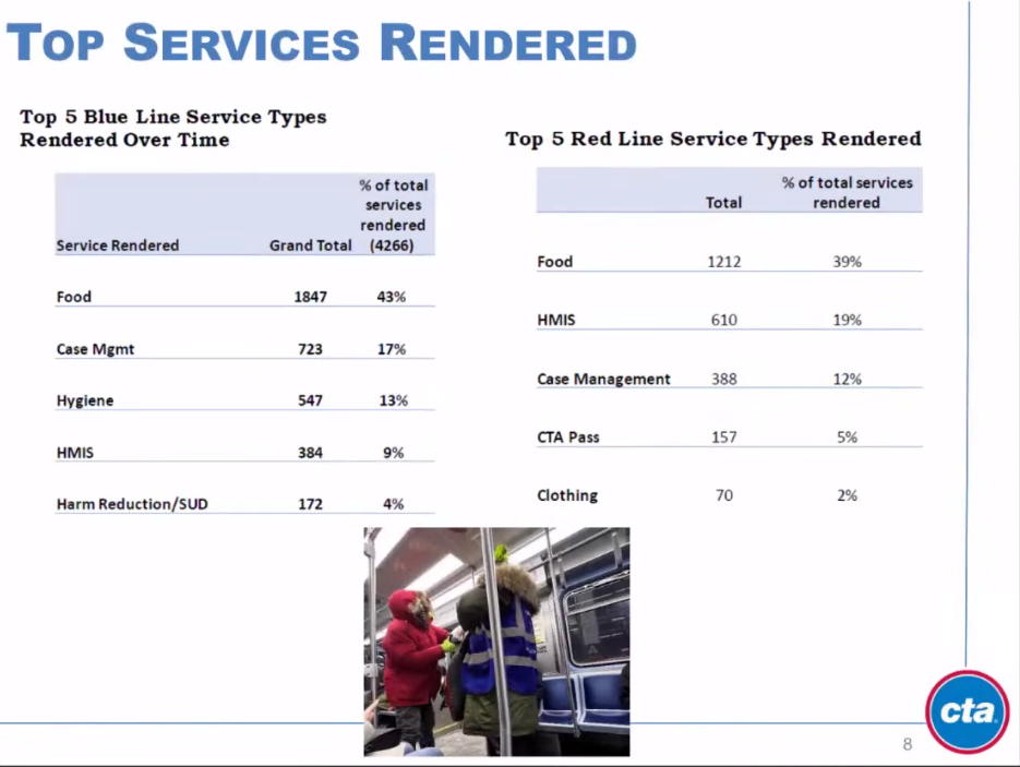 Still, McKone touted the success stories, mentioning a man who has been sheltering on the Red Line and got housing and treatment for untreated mental illness. “He [told us] recently that he was about to start a new job,” he said. “His job happened to be on the CTA, at the Second Chance program. It really shows the unique nexus the CTA has, and how we can be part of the solution as well.”