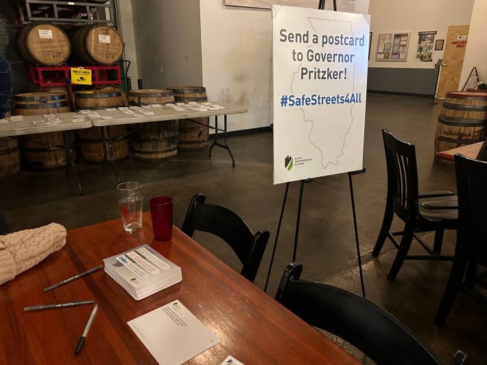 The annual event is a chance for ATA members to mingle, enjoy some local craft brew, and learn a little about the organization’s efforts for safer streets and better transit over the last year. A postcard-writing station was set up for constituents to ask Governor JB Pritzker and the Illinois Assembly to invest in Safe Streets for All—a campaign to reduce traffic violence through infrastructure investment and policy change that has been gaining traction in Chicago and beyond. A light dinner of wraps, salad and rice was set up near a table soliciting volunteers.
